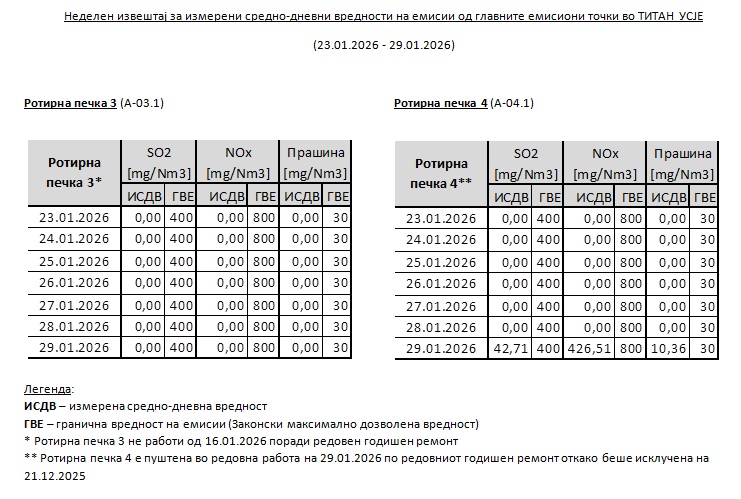 - Бројките недвосмислено покажуваат дека и кога ТИТАН Усје не работи, амбиенталниот воздух е со истиот квалитет, што е јасна потврда за тоа дека компанијата не е причина за состојбите со квалитетот на воздухот во Скопје. Загадувањето во Скопје беше високо и во изминатиот период кога ТИТАН Усје воопшто не работеше. Имено, поради редовен ремонт двете печки не работеа – едната, печка број 4, од 20.12.2025 година, а втората, печка број 3 од 16.01.2026 година, се до 29.01.2026 година, кога печката број 4, беше повторно вклучена, согласно работниот план. И покрај тоа што ТИТАН Усје целосно не работеше во овој период, највисоката вредност на ПМ 10 честичките достигна и до 275 микрограми на кубен метар. (Во прилог табели)