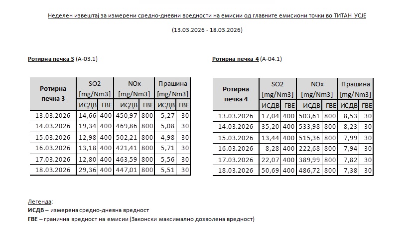 ТИТАН Усје: Неделен извештај за измерени средно-дневни вредности на емисии од главните емисиони точки (13.03.2026 – 18.03.2026)